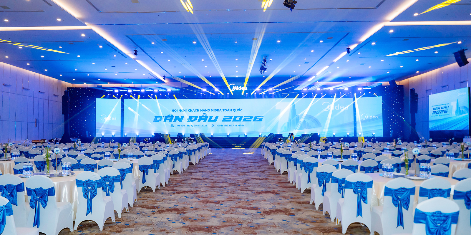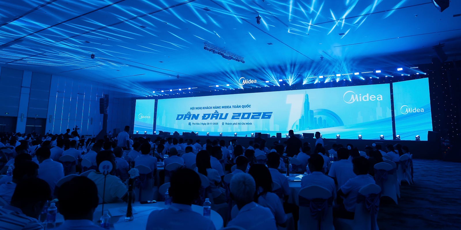 Trong hai ngày 27–28/11/2025, Hội nghị Khách hàng Midea Toàn quốc – DẪN ĐẦU 2026 đã được tổ chức trang trọng tại Trung tâm Tiệc cưới Adora, TP. Hồ Chí Minh, với sự tham dự của gần 900 khách mời là các đối tác, đại lý và nhà phân phối trên toàn quốc.
